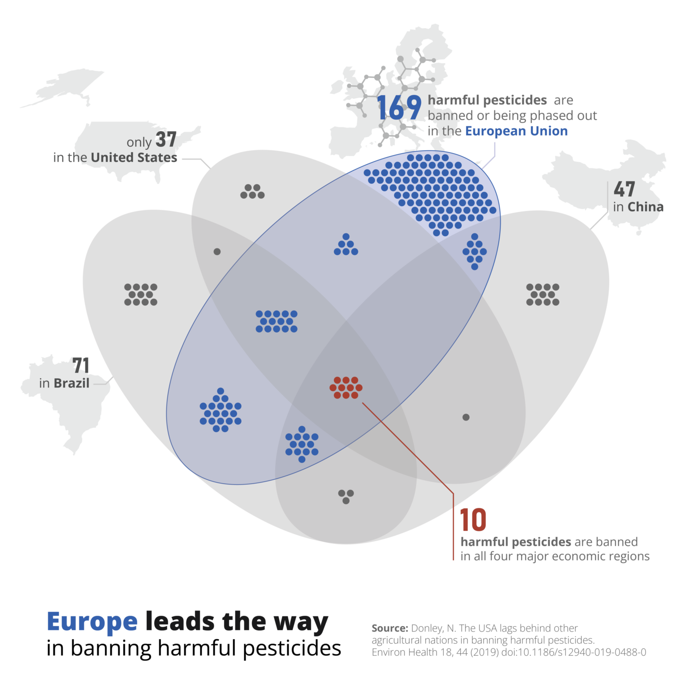 This Venn diagram shows the number of harmful pesticides, presented as dots, banned or phased out in four major economic regions (Brazil, the United States, Europe and China).